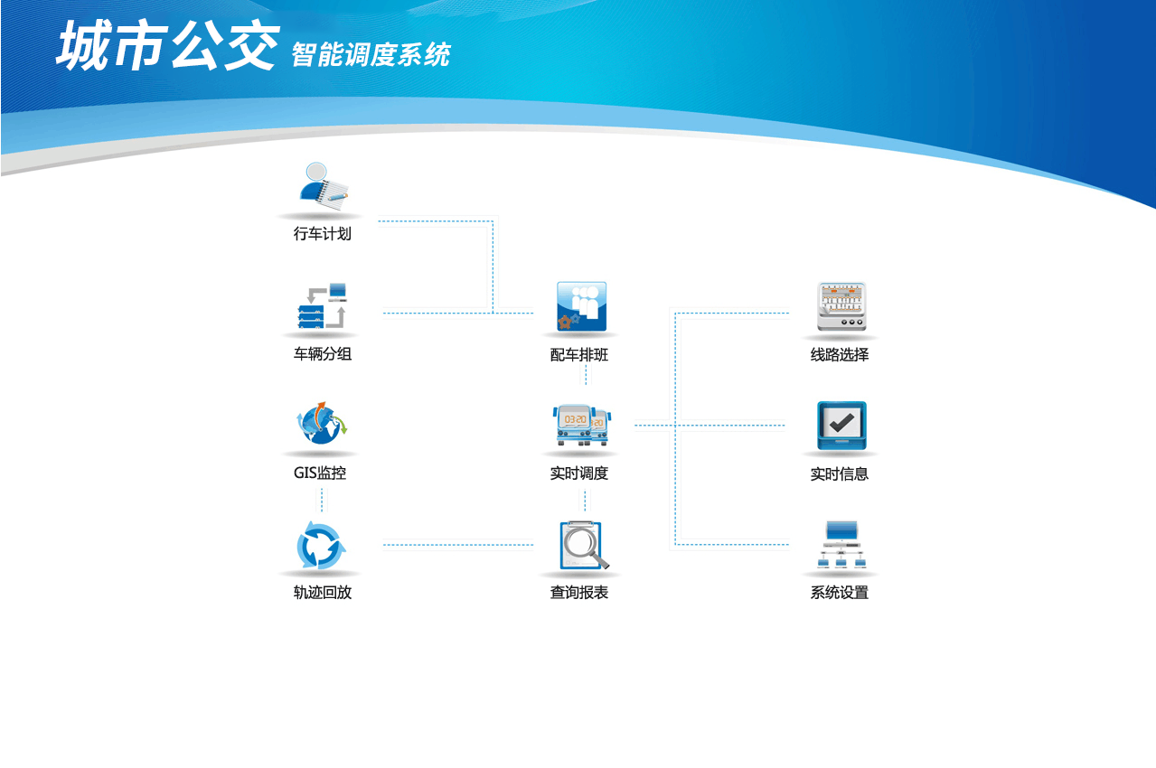 本系統由GPS全球定位衛星系統、GPRS/CDMA數據傳輸網絡、調度監控中心及車(chē)載設備等部分(fēn)組成。依托高(gāo)精度的(de)GPS衛星定位技術(shù),借助快速、穩定、保密的(de)無線通信網絡,集合了衛星定位、無線數據傳輸、GIS電子地(dì)圖等技術(shù),爲公交企業(yè)營運提供車(chē)輛位置及狀态監控、營運智能(néng)調度、智能(néng)自動語音(yīn)報站、行(xíng)駛記錄、安全控制(zhì)及營運數據管理(lǐ)等服務。